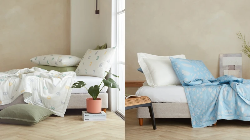 聯名系列包含用100%天絲纖維製作的被套組,有著能協助釋放濕氣、親膚及涼爽感受;以100%純棉布製成的涼被組,採用「活性印染」技術使色彩更持久,側邊還有精緻的撞色滾邊工藝,實在想抱緊處理!