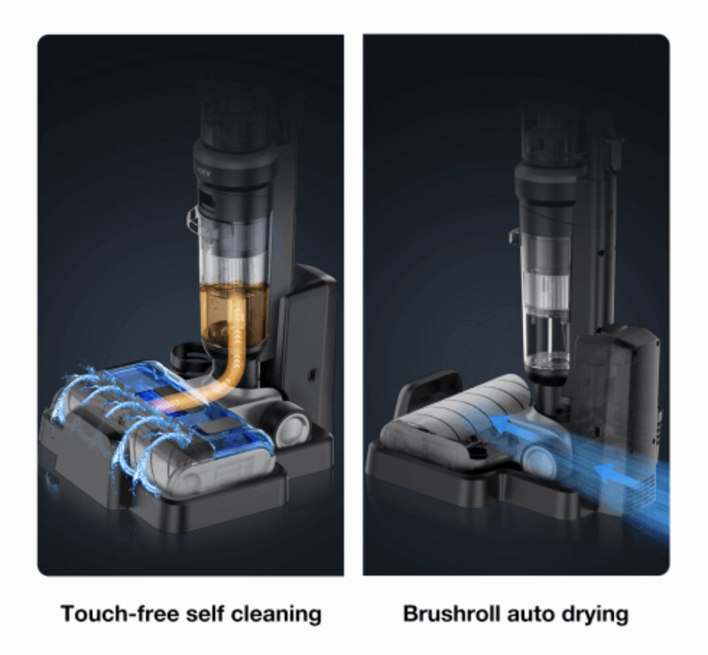 打掃完後也不需清洗滾刷,只要一鍵就可以自動清潔,以高速水流沖洗滾刷5分鐘,洗後緊接獨家風乾功能,4小時工序還你乾淨滾刷,氣味不易殘留,輕鬆創造質感生活!