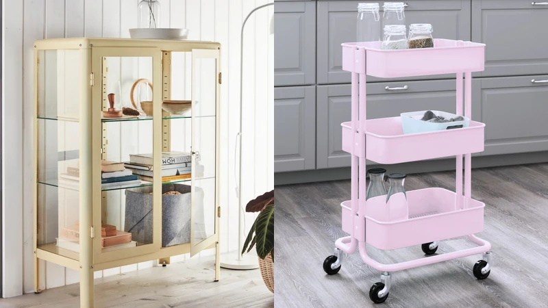 而淺黃色的「FABRIKÖR玻璃門櫃」,擁有可調式層板及櫃腳,外型與功能樣樣兼具,輕鬆把時髦明亮感受帶回家;穩居熱銷排行的「RÅSKOG推車」,更推出了淺粉紅色款式,能分層收納各式物品,不論文具、化妝品都超適合,是不是該買一台?