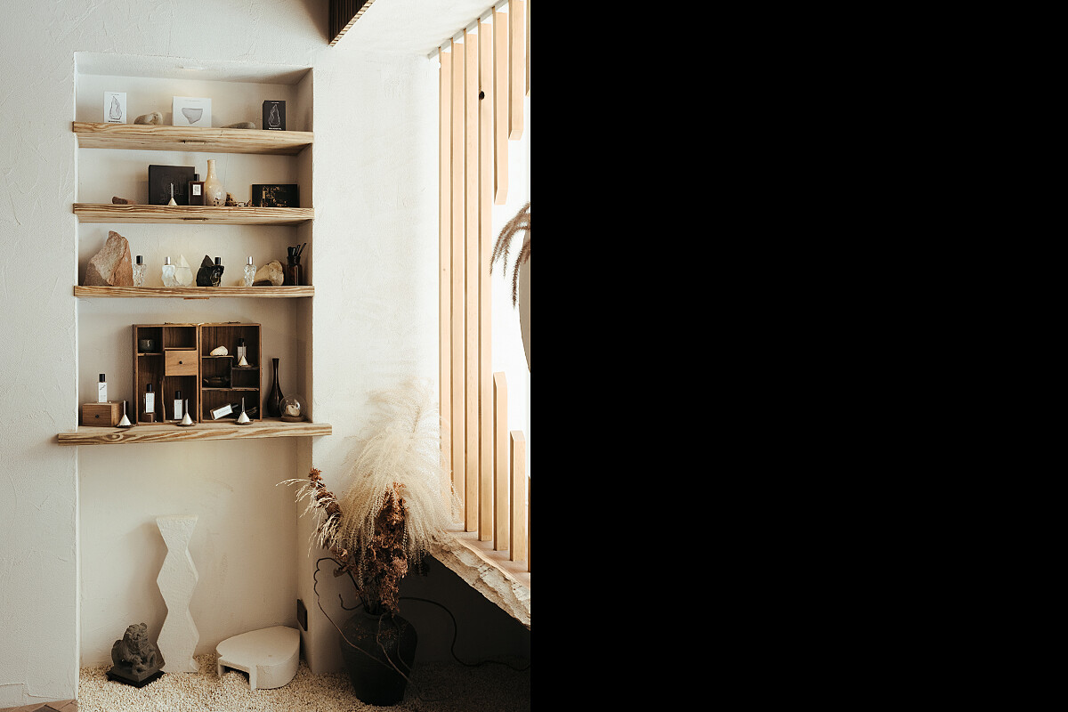 空間由店主 Dorian 親手打造,從設計到施工皆一手包辦,空間風格則呼應了店名,使用大量中性的色彩、自然材質,以低調靜謐不張揚的姿態融入於街景之中;踏進「La brume 若水」便能感受到在溫潤質地帶來的美好氛圍,並伴隨著幽暗的光線、空間裡芬芳舒服的氣味,彷彿浮躁的心也就此沉靜安定了;空間中最為醒目的是一旁的原木桌椅,上頭有各式天然香料,偶爾還能成為茶席空間;牆面則使自然漆圖飾,並部份挖空造型,成為展示香水的陳列空間,讓造型各異的香水毫不違和的融入空間角落。