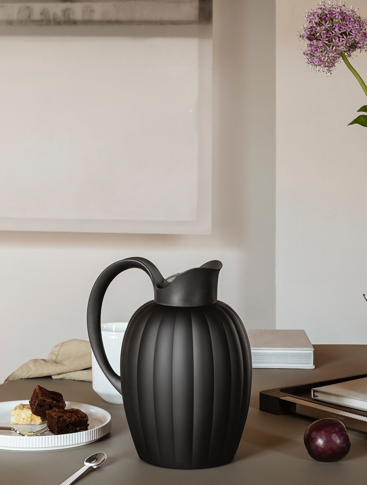 2022秋冬系列外觀延續原創銀器版本,採用更加輕盈的塑料材質製成,並有午夜黑、暮色藍、暖磚紅三款新色,霧面質感能融合各式空間,內層結構則為不銹鋼材質,採旋入式瓶口設計,提供了完善的密封性,也能避免液體溢漏,可裝納容量1000ml的液體,保溫時間也長達六小時,亦可讓溫熱水維持在80度的恆溫狀態,完全體現了實用主義的北歐哲學,也展現了當代摩登的設計品味。