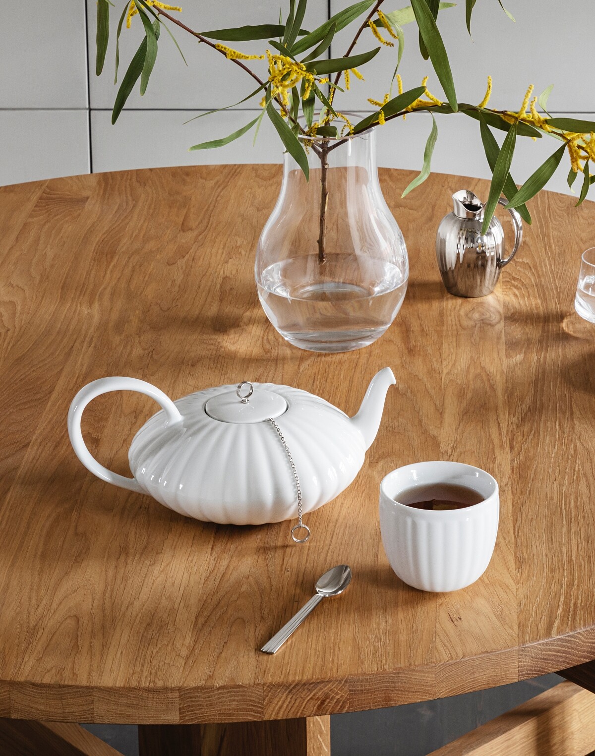 以白陶瓷打造的南瓜造型茶壺,搭配具有隔熱功能的茶杯,外觀使用細膩的刻紋裝飾,優雅示範了北歐的工藝、美學,也用以致敬西瓦德・伯納多的經典設計。茶壺內含掛鏈式不鏽鋼過濾器,壺蓋上方裝飾鋼製細節,內裡則有矽膠密封圈,隔熱與密合結構讓品茶體驗更加臻致完美,白瓷茶杯使用雙層中空的白瓷結構,則具有隔熱功能。