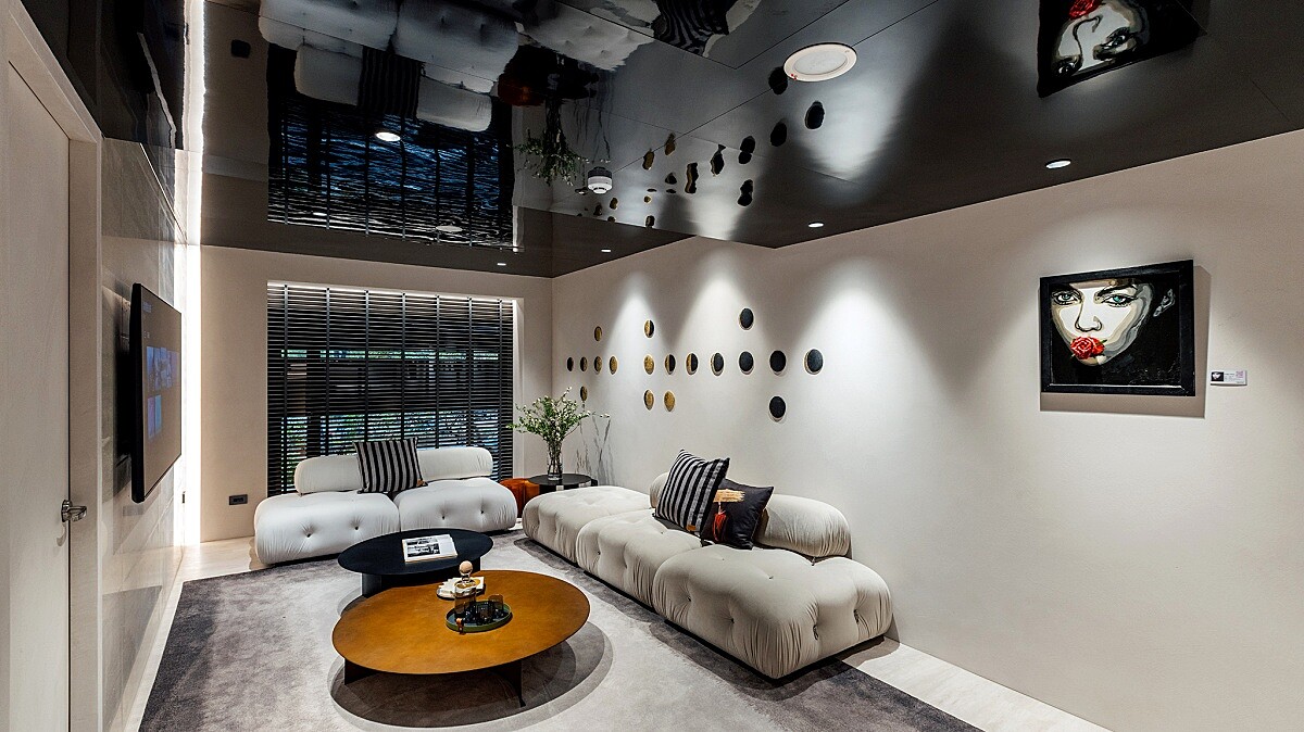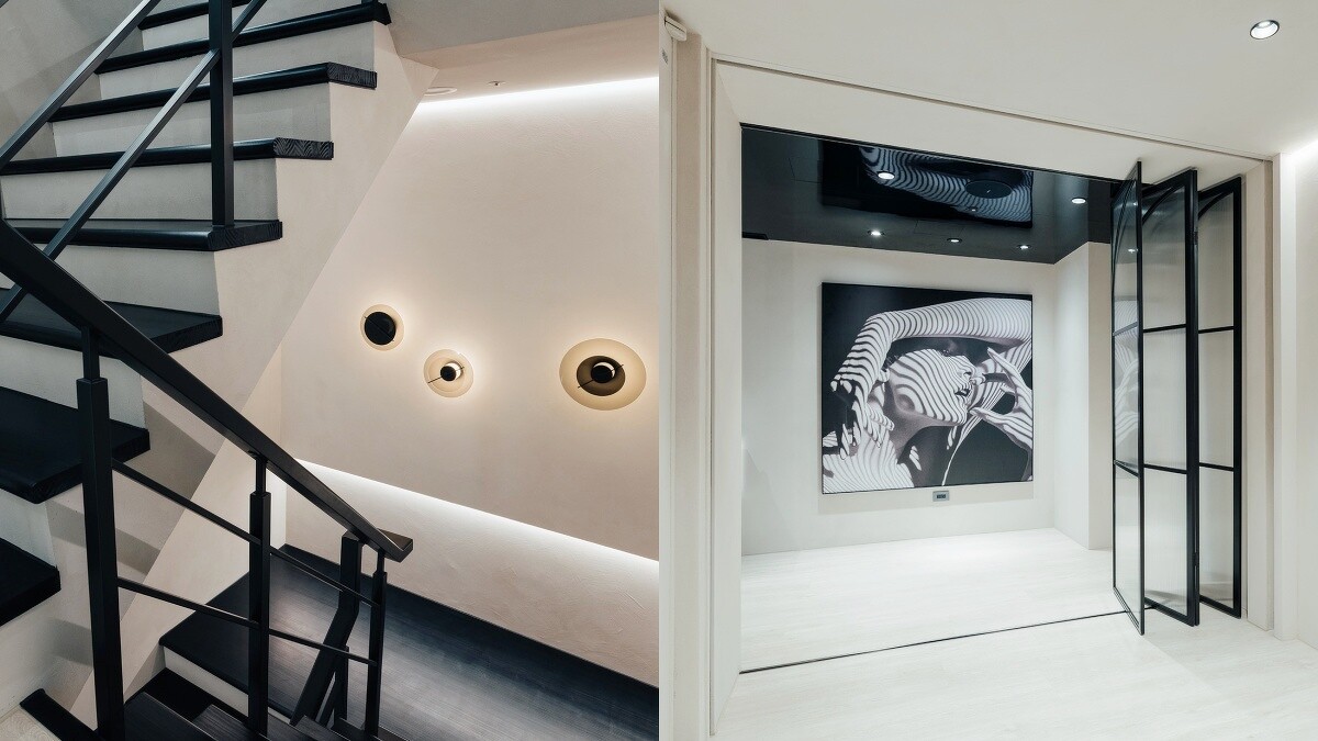 樓梯夾層有3盞能動手互動的Delumina壁燈、倫敦時尚攝影師Sølve Sundsbø的大尺寸黑白作品,以及黑色鏡面天花板,洋溢著簡約現代質感。二樓同樣能讓身心淨化!多座彩色玻璃、光點牆面玻璃球、紐約MOMA永久收藏的Molo Soft Wall,以及藝術家Attilio Chien簡明正展出11件系列作品「親吻」,為體驗精緻睡眠的時刻,更添對美學生活的靈感與想望。