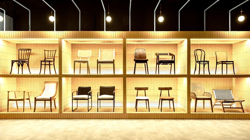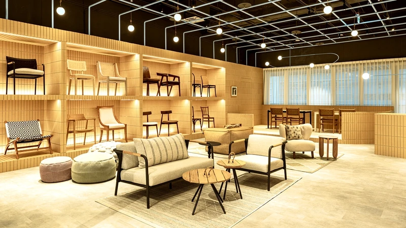店面左手邊有一整面壯觀「椅子牆」,能讓消費者清楚明瞭欣賞設計細節。有7OCEANS自有品牌室內餐椅,加入印尼的手工編織及傳統技藝,極具熱帶風情。中間也不乏異材質拼接設計,是時候汰換老舊家具了。