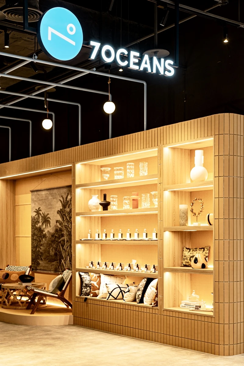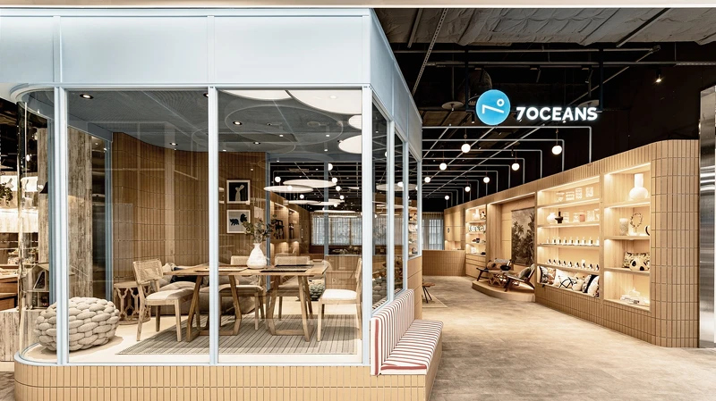 創立邁入18年的7OCEANS七海家具家飾品牌,別於士林採預約制的展銷中心,首度進駐百貨開設旗艦店,由芬蘭「Yatofu Creatives也兜設計」操刀空間設計,將品牌由戶外家具跨足室內空間的歷程化作設計元素,藉由陶土磚、藤編、木材與暖黃色調,交織出一片如漫步海灘的寫意氛圍。