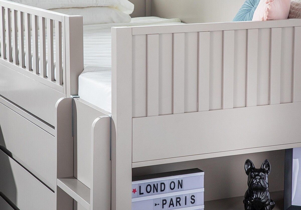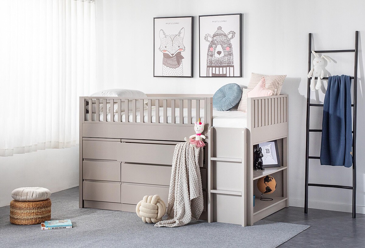 不同大小的收納櫃,以及側邊開放式收納櫃,讓小孩可以輕鬆整理自己的玩具、衣物、書籍等物品,在保持整潔的同時,培養孩子分類收納整理的好習慣。而122公分高的床與半開放式護欄,讓爸媽可以輕鬆在床邊與寶貝互動,並觀察確認安全舒適睡眠狀態。