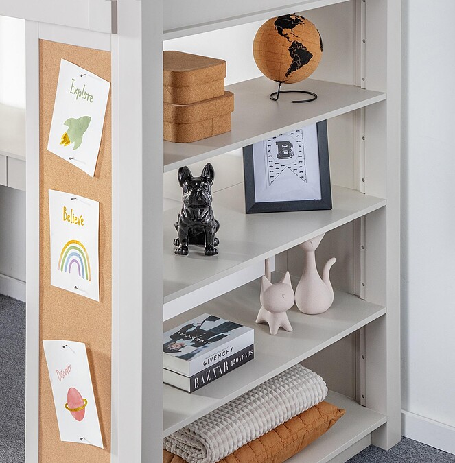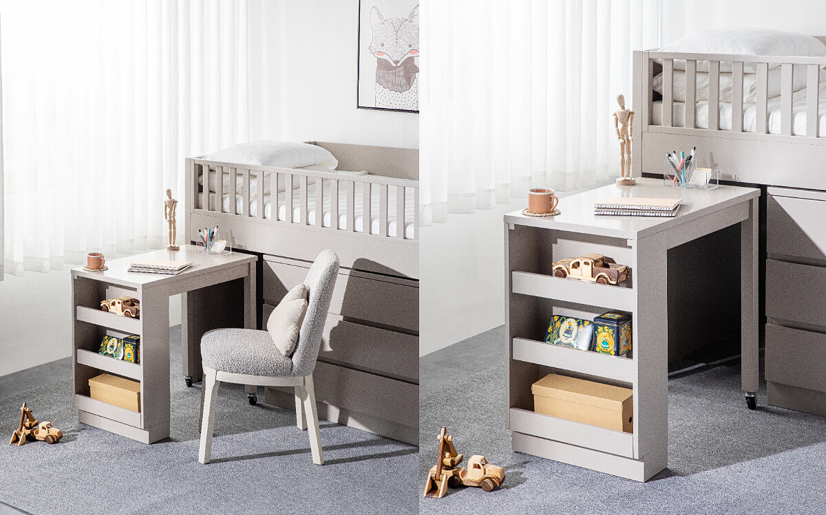 除了以上特點,為了讓孩子可以自由展示喜愛的物品,側邊收納櫃深度更有45公分,有別於一般只能放書本的侷限,讓整體空間更具靈活性,也讓自家寶貝有更多的延展性可以打造自己的小天地!