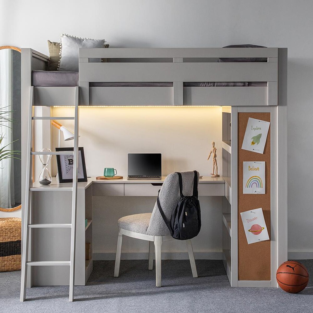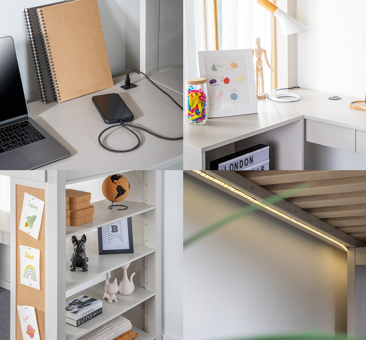 首先是桌面設有USB+Type-C充電孔,滿足3C學習趨勢,方便使用之餘也減少桌面容易因充電線、延長線導致的凌亂感,更易維持簡潔提高專注力。床底下設有觸碰式三段LED安全燈條,具有UL&MET雙認證,不論是閱讀輔助燈或小夜燈都可以勝任,減少燈具的購入外,也讓床底空間保有明亮氛圍。側邊除了收納櫃外,更貼心設置軟木塞記事板,可以當作日常備忘錄、親子留言板外,還可展示作品照片等,讓孩子佈置最me time的角落。