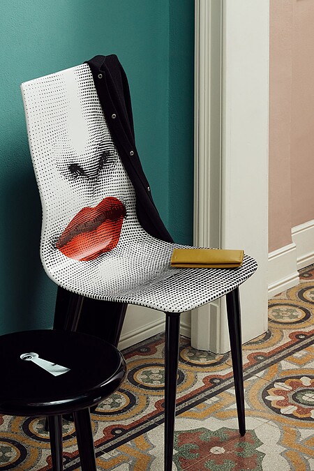 此款紅唇的餐椅,以手工絲網印刷和細膩彩繪呈現,採用實木椅腳,使其更加穩固,是Fornasetti品牌中的經典之作。其設計巧妙地再現了歌劇女伶Lina Cavalieri的誘人面容,並巧妙地加入了俏皮的色彩點綴,使整件作品顯得更加鮮明和吸引人。