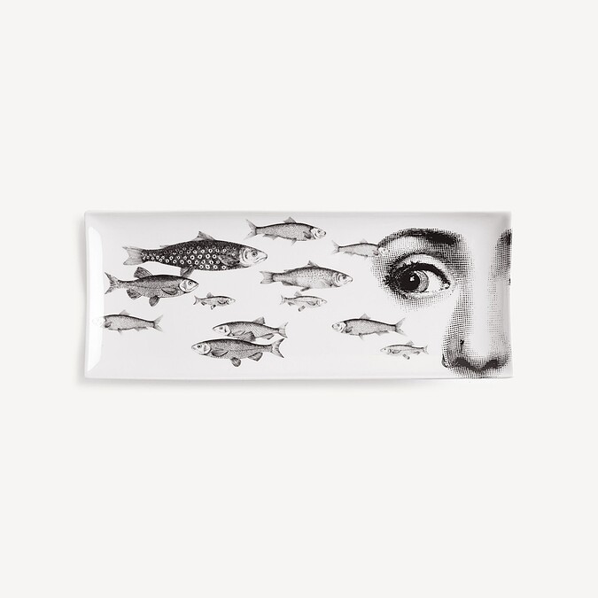 Fornasetti的設計獨特且精緻,充滿幽默、懷舊、隱喻與暗示。這樣的設計手法讓家具、配件和瓷器都像是在與藏家對話般。這個長方形的瓷盤上,經典的女伶臉龐與魚彼此凝視,僅透過眼神進行深入的交流和對話,恰如此次活動的主題所呈現的精髓。