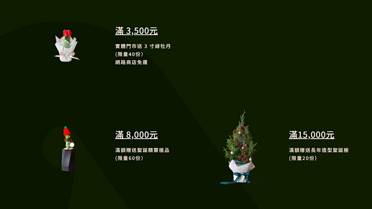 在2023年,有肉SUCCULAND歡慶創立8週年,即日起在門市中推出一系列創意陳列,包含適合擺放玄關的大型多肉聖誕樹,還有運用紙箱或木箱打造的聖誕樹塔、帶有絨毛元素的「麋果暖絨」植栽組、為空間增添氣氛的「燭夜歡騰」,不妨親自走訪一遭!消費滿3500/8000/15000元都將另贈多肉好禮。