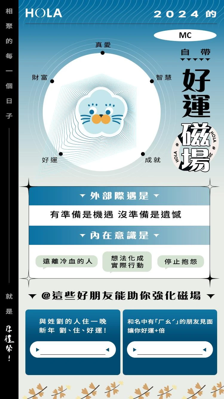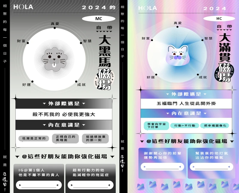 現在就開始點擊進入測驗網址,看看你的2024磁場引力測驗是什麼?HOLA加碼贈獎(由此去),就有機會獲得價值NT10,000的禮券喔!