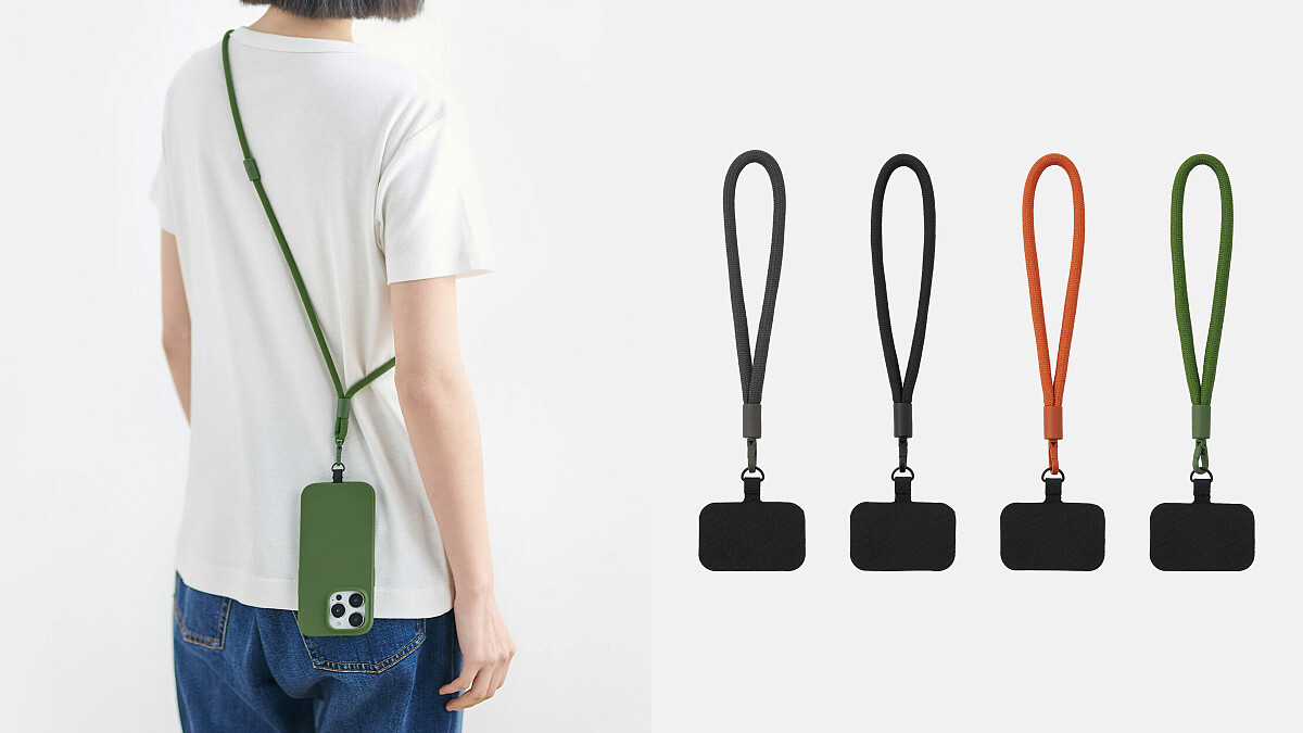 MUJI無印良品近年不斷開發3C配件領域,2024春夏再推出背帶式及腕帶式手機掛繩,並有深灰、黑、綠及橘色等選擇,跟每天服裝配色塑造型格。預計6月上市,售價150-199元。