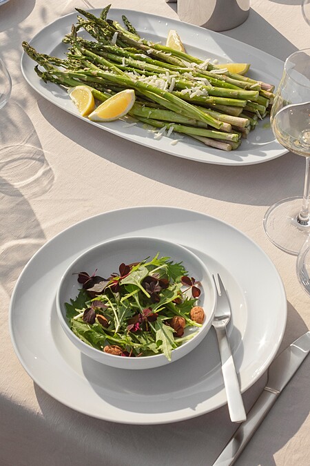 此系列白瓷餐具包括多款尺寸和款式,包含三款尺寸(27cm、22cm、16cm)的圓形淺盤,兩款尺寸(21cm、15cm)的圓形深盤,帶有把手設計的大號餐缽與小型餐碗,以及橢圓長形瓷盤和馬克茶杯。多元的尺寸與功能,可搭配前菜、沙拉、湯品、主菜和甜點,對於講究生活、餐桌美學的消費者來說無疑是完美的選擇,也能提升用餐體驗。
