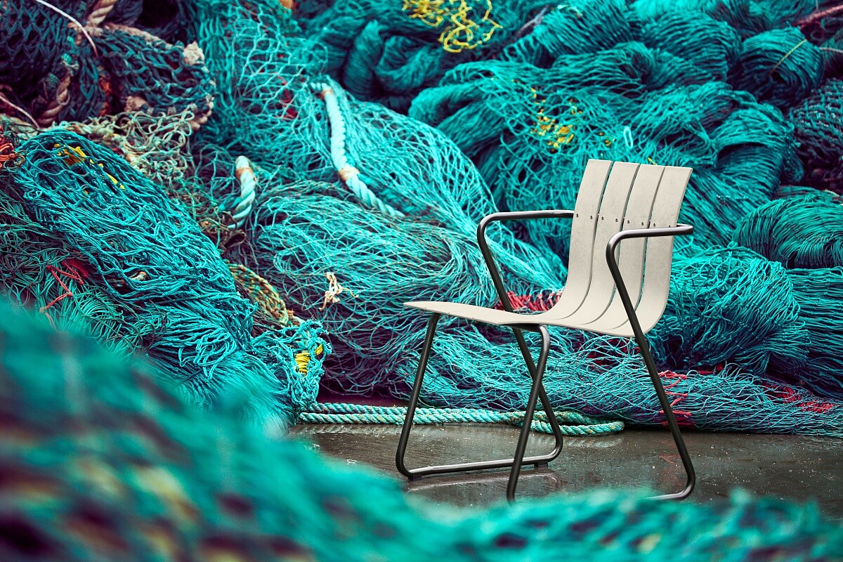 北歐傳奇設計師 Nanna Ditzel 與丹麥品牌 Mater 合作,將1950年的經典家具 Ocean 重製再生,運用大量海洋廢棄塑料、廢棄木、再生PP等材質組合製成的休閒單椅,約莫等同使用了29個寶特瓶,於今年推出一系列新色。