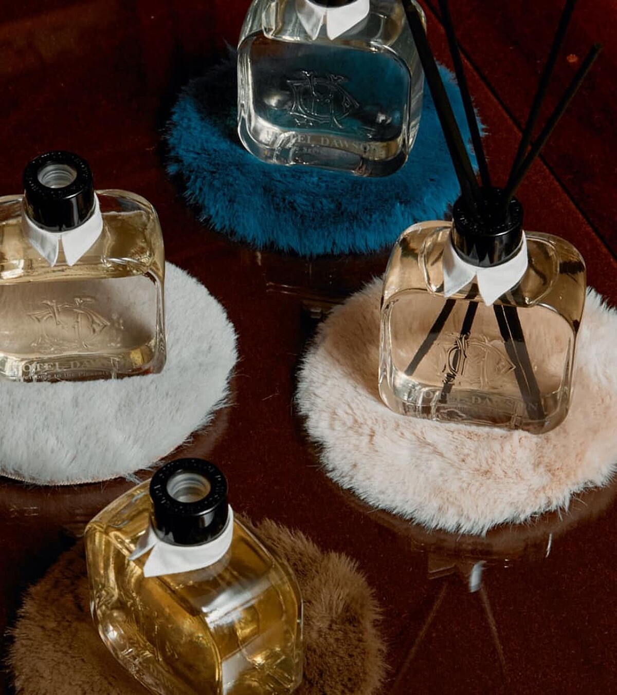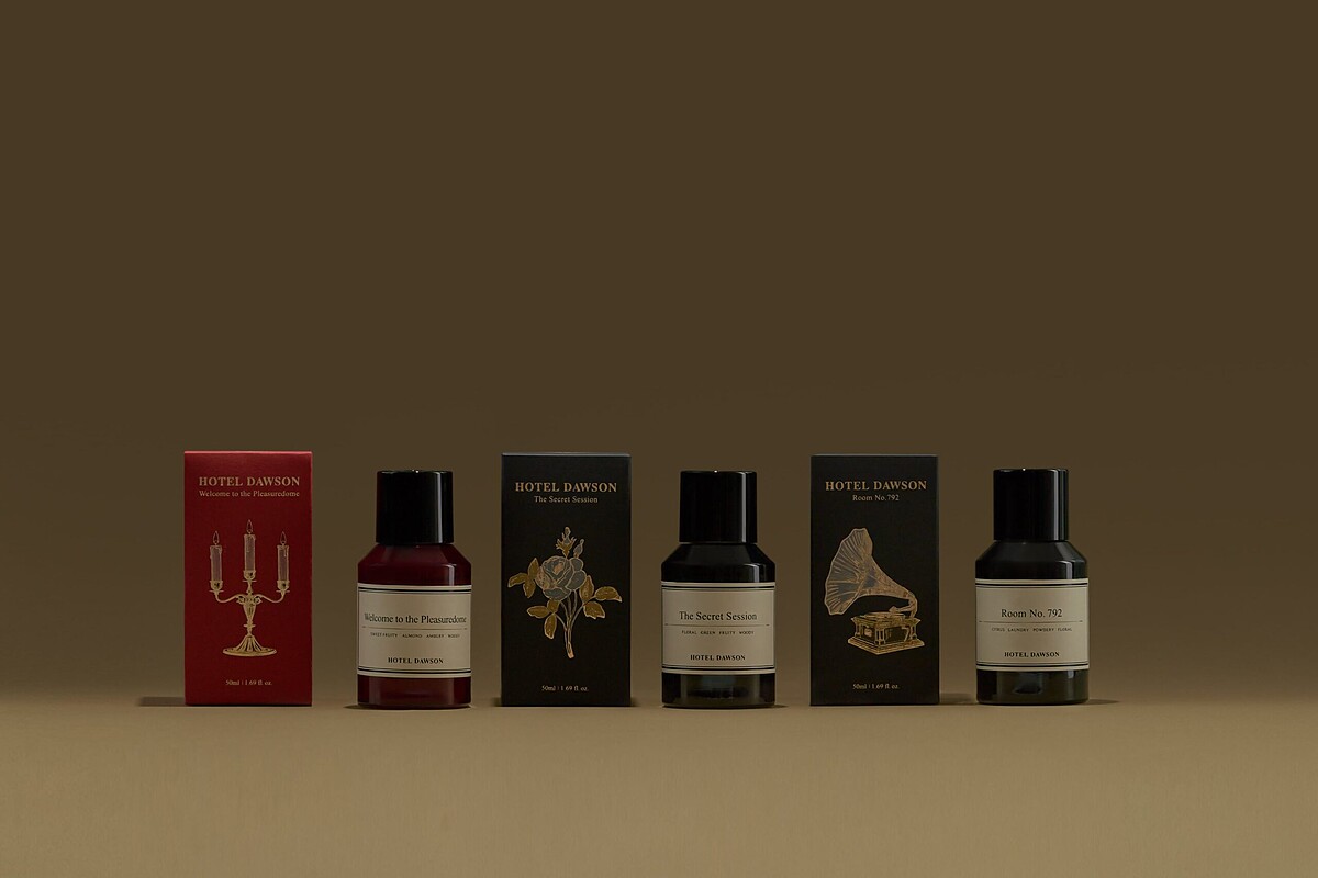 六款香氣:792號房(清晨柑橘)、秘密宴會廳(鈴蘭淡玫瑰)、金燦莊園(黑櫻桃玫瑰) 微醺旅行 (雪松威士忌)、香檳進行曲(鳶尾花雪松)、午夜邂逅(松木麝香) 每一款 Hotel Dawson 室內擴香,均附有絨毛圓墊,以及五支擴香棒,美麗復古外盒包裝皆代表一段與香氣有關的故事,瓶身上的小領片設計,則象徵以飯店概念為核心的品牌精神。