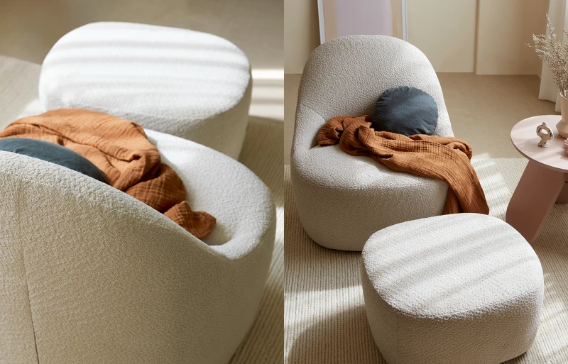 細膩的椅背線條銜接著流線飽滿的輪廓,使這張單人沙發展現出獨特的韓系文青風,卻又不失溫馨柔和感,輕鬆就能打造屬於自己的療癒角落,坐在上面休憩放鬆。而單顆座椅精緻輕巧,無論妝點在客廳、臥室、書房都合適,靈活又不減其功能性。同組的沙發凳使用性也很方便,擺放雙腳、物品,或當小椅凳都都沒問題,不僅是空間亮點,更能適應任何生活場景。