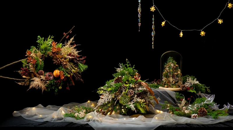 以多樣花材堆疊出的優雅動人情懷,輕輕勾勒出節慶的柔和美感。