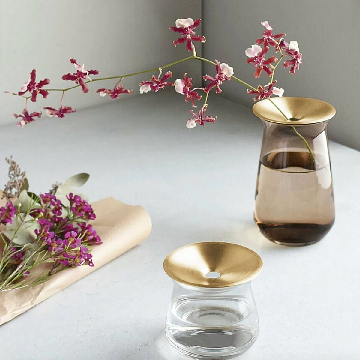 若選擇窄口花器,搭配 1~3 根高矮不同的簡約花材,如單支鬱金香、繡球花或金橘,不僅操作相當簡單,還能突顯花材的線條美,避免對稱構圖帶來的呆板感,薦以下花器讓新春佈置更具巧思與風格。