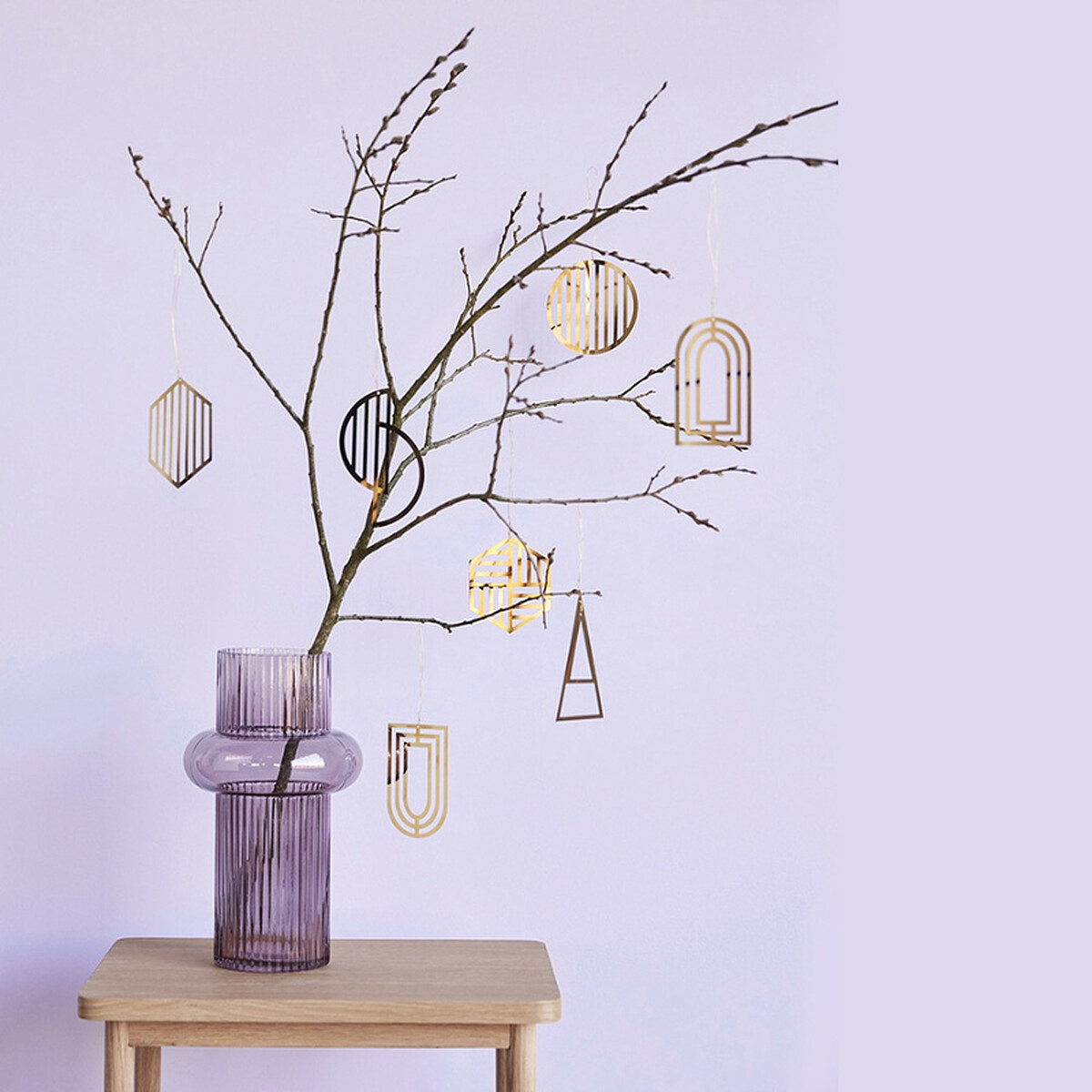 Hübsch 粉紫線條造型玻璃花瓶採用拼接不同形狀的特殊設計,搭配低彩度丁香紫,既能插花又可作為藝術品陳設,是兼具功能與美學的百搭居家裝飾。