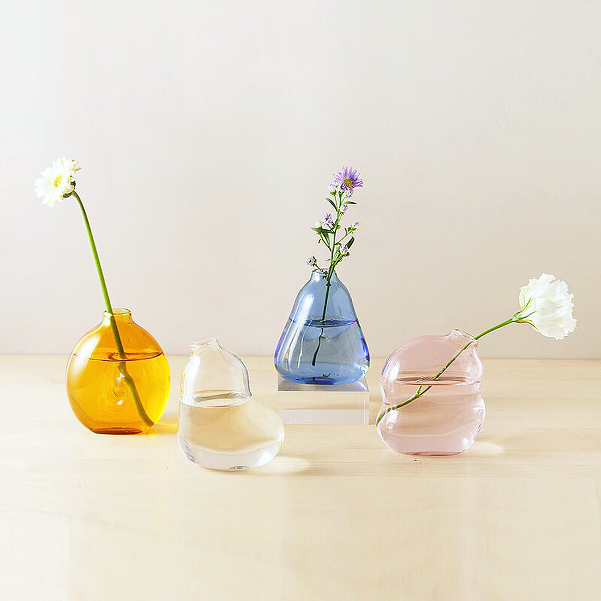 好玻 GLAS 字樣設計花瓶,以 Glad(喜悅)、Liberal(自由)、Adorable(迷人)、Sweet(甜蜜)為靈感,泡泡感日常花景帶來輕盈與春意,讓空間生機盎然。