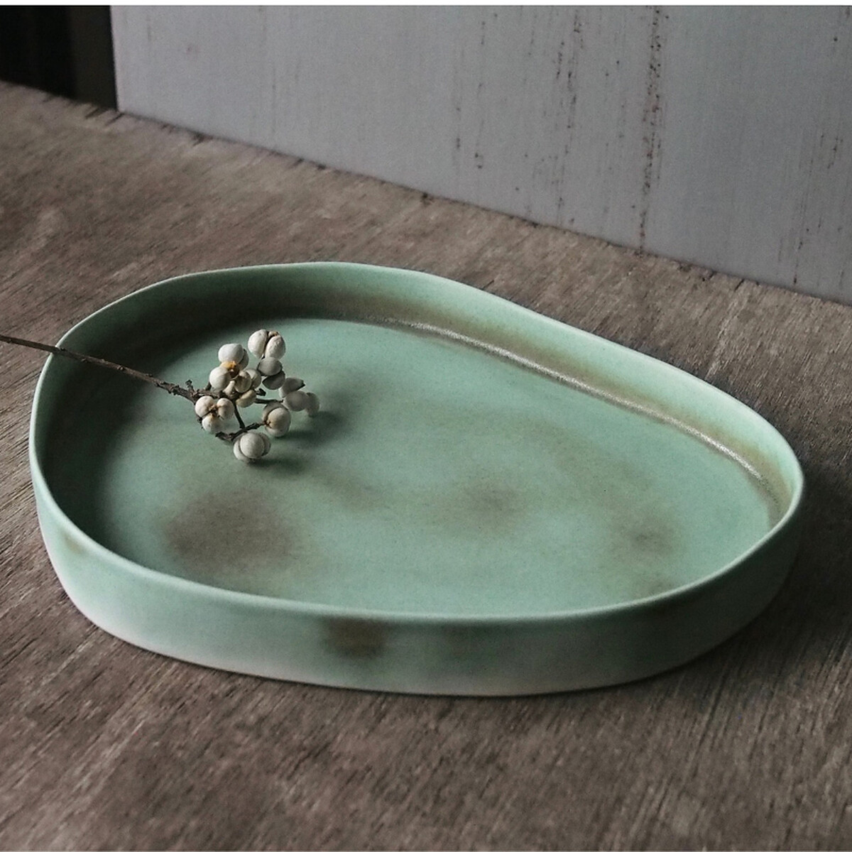 有陶孩有的青山綠陶瓷平盤,具備手工打磨獨有的溫暖觸感與圓潤邊角,很適合擺上落花、落果,營造隨興鬆弛感。