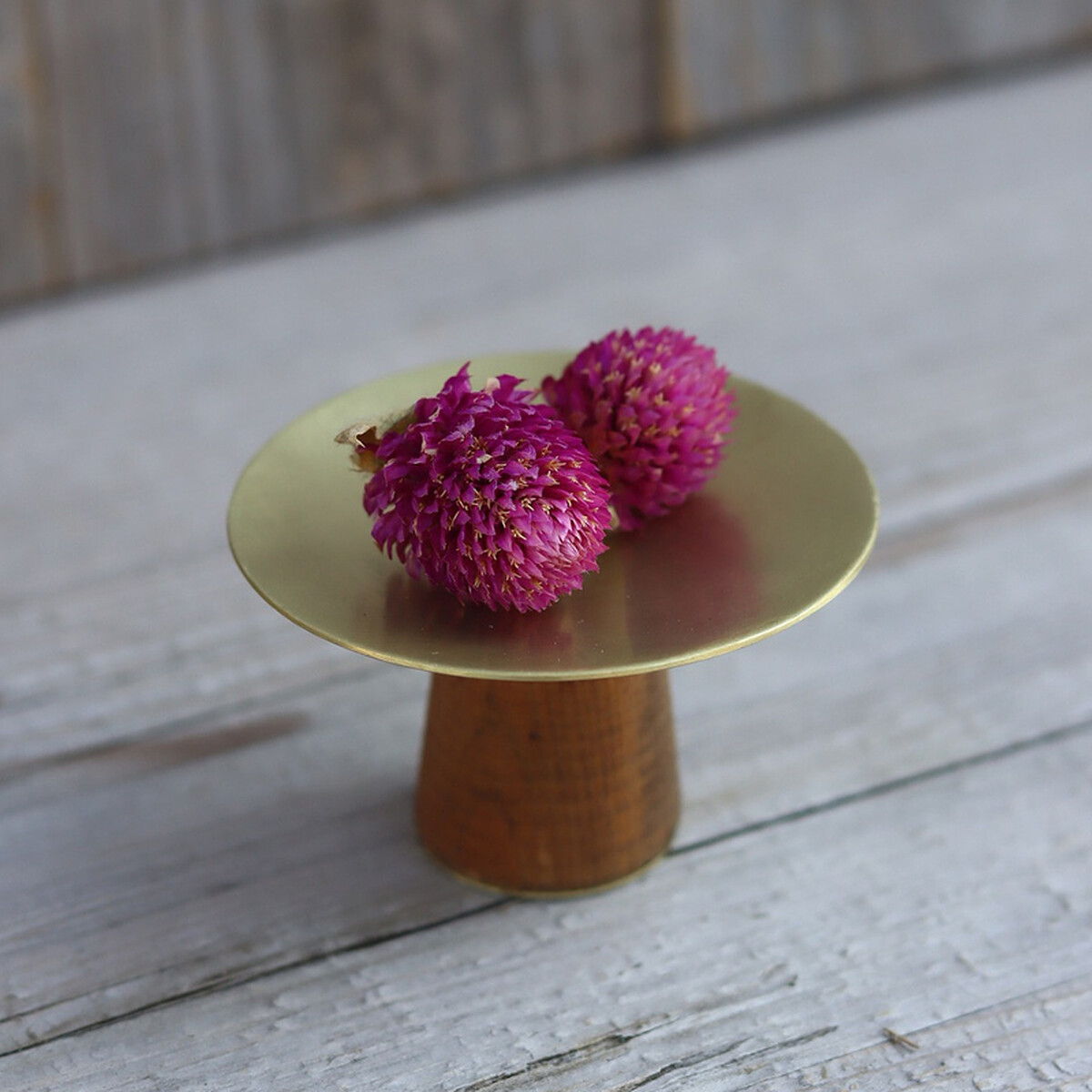wato 的黃銅高腳盤,以木質底座結合黃銅盤子乍看古色古香,但大面積金屬元素又能無違和融入現代裝潢。
