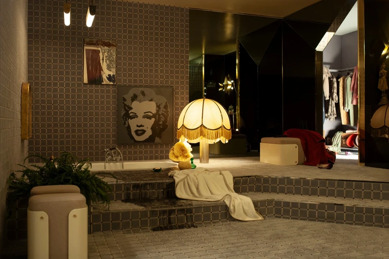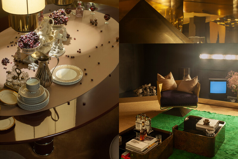 極致品味與戲劇化空間,引領觀者穿梭於現實與虛構之間。進入展場,就像走進由 Dimorestudio 執導的電影,懷舊情懷顯露在紅絨布幕、豹紋地毯、金屬燈飾,每處細節都流露品牌對材質與空間敘事的精準掌握。