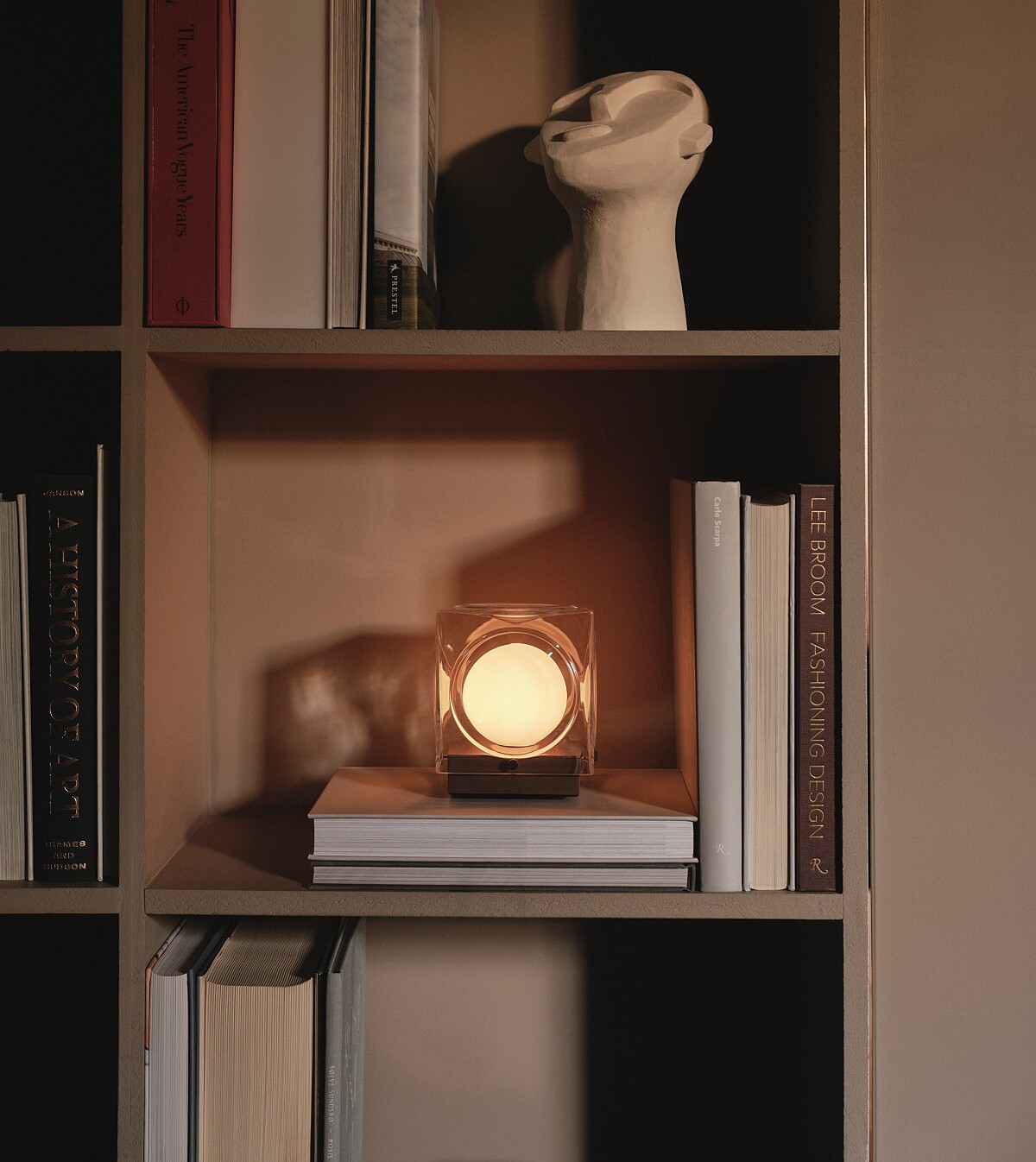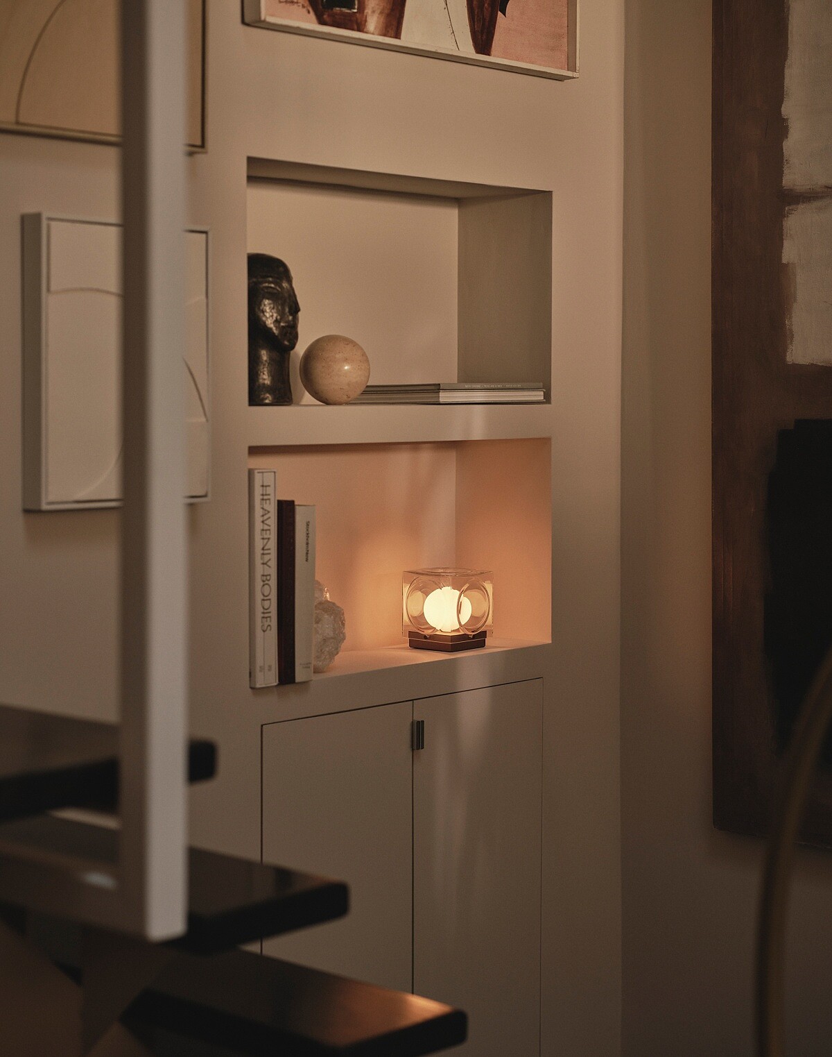 除了回顧經典,《From Here Now》同時也是 Lee Broom 最新作品《Chant Portable Table Lamp》的全球發表會。這是他首次嘗試可攜式照明類型,延續2022年米蘭設計週推出之同名吊燈的設計語彙。其靈感來自1970年代建築常見的玻璃磚,《Chant》桌燈以手工吹製玻璃打造出方形幾何與圓形凹槽圖樣的對比結構。其雕塑感強烈,帶有懷舊感,也兼具當代簡練線條。燈體提供霧面與透明兩種版本,搭配拉絲金、銀、古銅三種金屬底座,整體質感紮實而細緻。