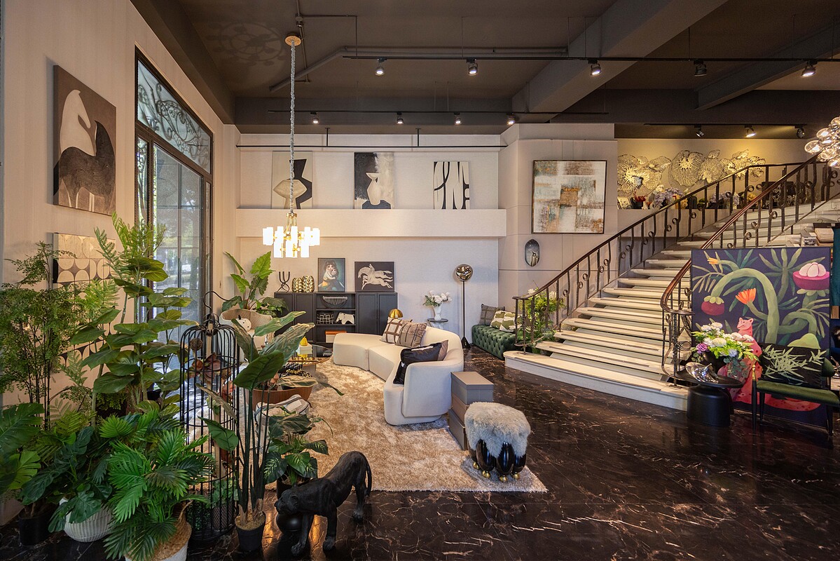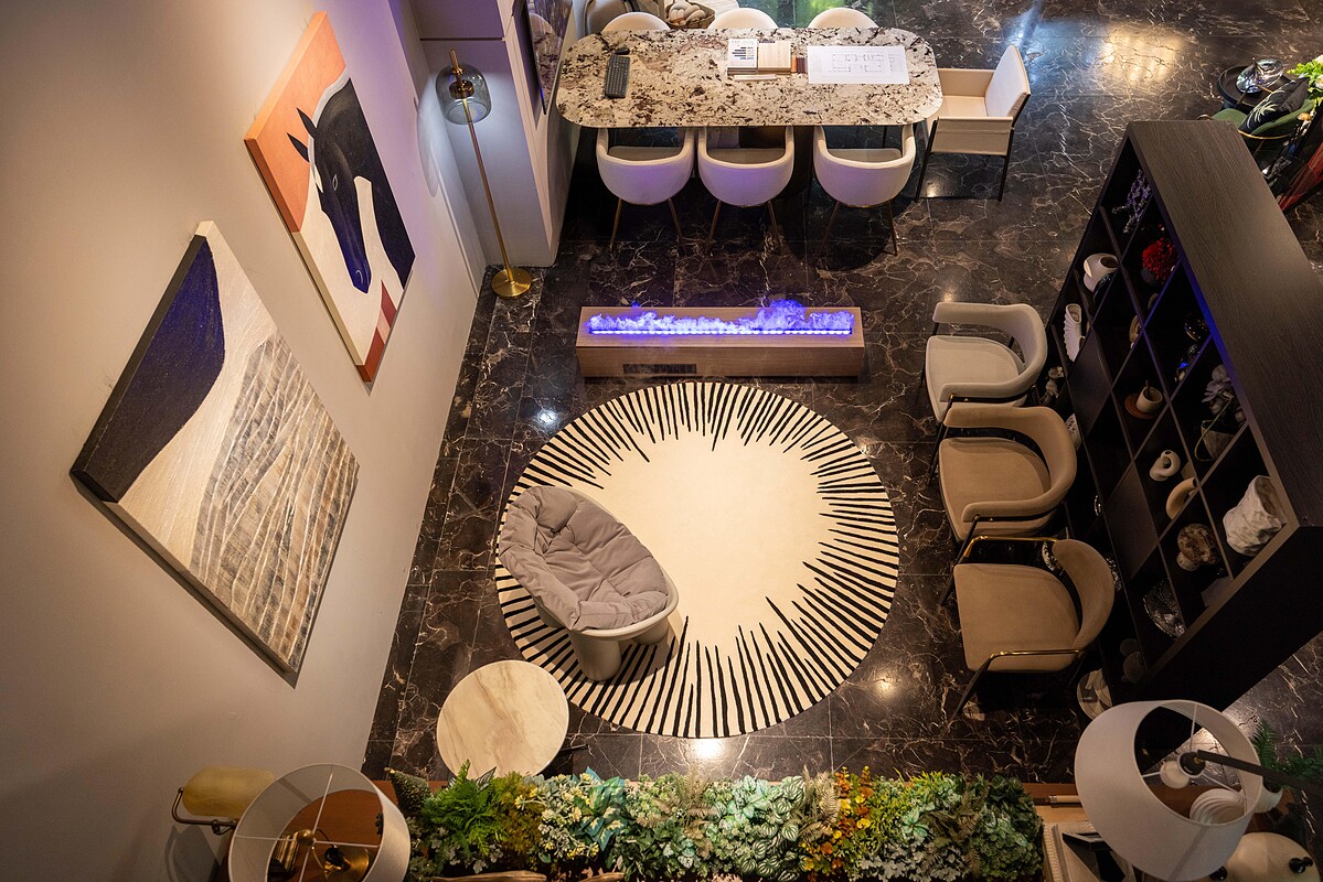 走進比沙列空間設計,很難不被氛圍吸引!這裡不像一般辦公室,更像是一座奢而不張的生活舞台。挑高的樓層結構、一盞吊燈、一席地毯、一張長凳,錯落分布的物件不是展示,而是預演。「空間不一定靠牆才能分隔,一個物件的位置、一束光的落點,都能讓人找到自己的位置感。」張靜峰說。