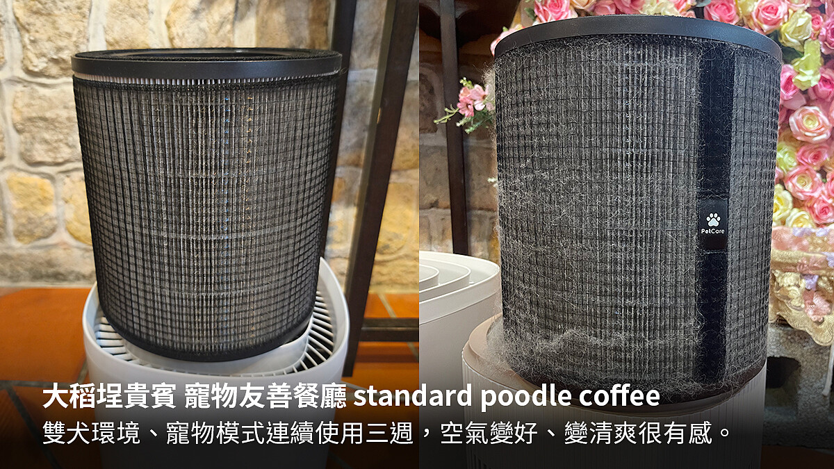 店裡有好多隻可愛貴賓狗的寵物友善餐廳「大稻埕貴賓」分享:「毛孩多的店面很需要有聰明幫手!伊萊克斯『極適家居500 寵物抗敏空氣清淨機」用了三週後,每次清濾網,都充滿著吸進去的毛,機身上顯示空氣品質燈號也從黃橘變成大多時間為綠燈,整間店的空氣變好、變清爽很有感,讓我們的寵物友善空間更乾淨舒服呢。』