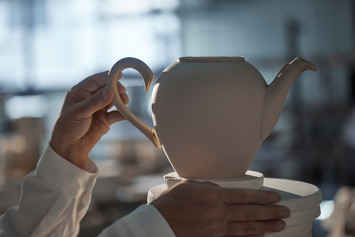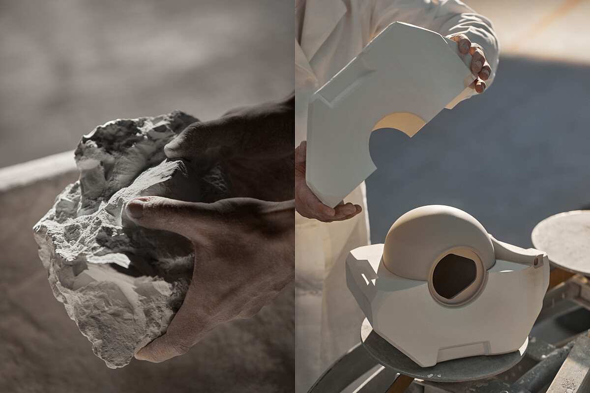 「Punti a Maglia」系列全數於以瓷器聞名的城市—利摩日(Limoges)製作,工匠以高嶺土、石英粉與長石調製瓷泥,接著在攝氏一千四百度高溫下燒製,並於二十四小時內緩慢降溫,使表面緻密、光潤而堅韌,其質地就成為展現針織紋理的完美畫布。