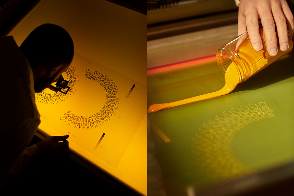 圖案的製作同樣講究,要先以絲網印刷將細線圖樣轉印到底片,再以手工對位於瓷面。這個過程需要高度專注與精準的手勢,任何微小偏差都會改變整體平衡。最終完成的線條乾淨而有層次,像柔線被光照亮,呈現出溫和的立體感。