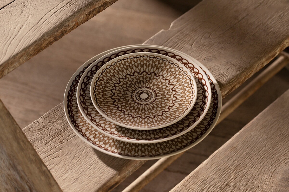 此次新系列餐具採用杏色、酒紅、海軍藍、赭色與 kummel 色等色調。由於顏料在燒製過程中會因氧化反應而產生變化,工匠需多次試驗才能掌握色澤的穩定與深度。這些細節讓每件作品都帶有微妙的差異,像手工針織衣物一樣各自成形。柔軟的羊絨與堅實的瓷器雖屬不同材質,卻同樣取自自然,也都需要經過時間跟溫度的淬鍊,最後成為陪伴日常生活中重要的存在。此系列現已於指定 Loro Piana 門市販售。
