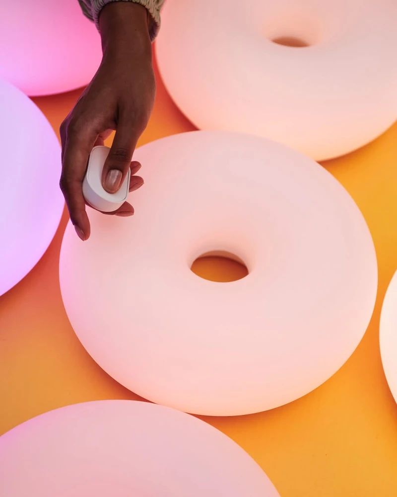 在VARMBLIXT系列中,她設計的初代作品探索家居燈光對情緒的作用,以光滑的橙色玻璃,營造出溫暖而穩定的光暈。而在2026年迎來升級版,她則將材質改為霧面白色玻璃,這樣的設計能讓光線從燈體內部自然散射,呈現柔和不刺眼的發光效果,也為多樣化色彩打下基礎。除此之外,她親自為新版「甜甜圈燈」調配12種預設色彩序列,讓每一段光色轉換,都能精準對應不同情緒與空間氛圍。