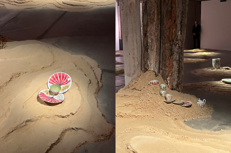 空間的光線隨著時間搖擺,從藍轉白,再由黃轉為粉,呈現陽光照在海面上的姿態。餐瓷作品在此成為了海藻、珊瑚、海蓬子與海扇等海洋植物,有些靜靜地棲居在濕潤的潮汐間,有些則像是搖擺於洋流中,掠過高嶺土鋪展的海床,隨著浪花的拍打,在這片海之庭園中自在生長。