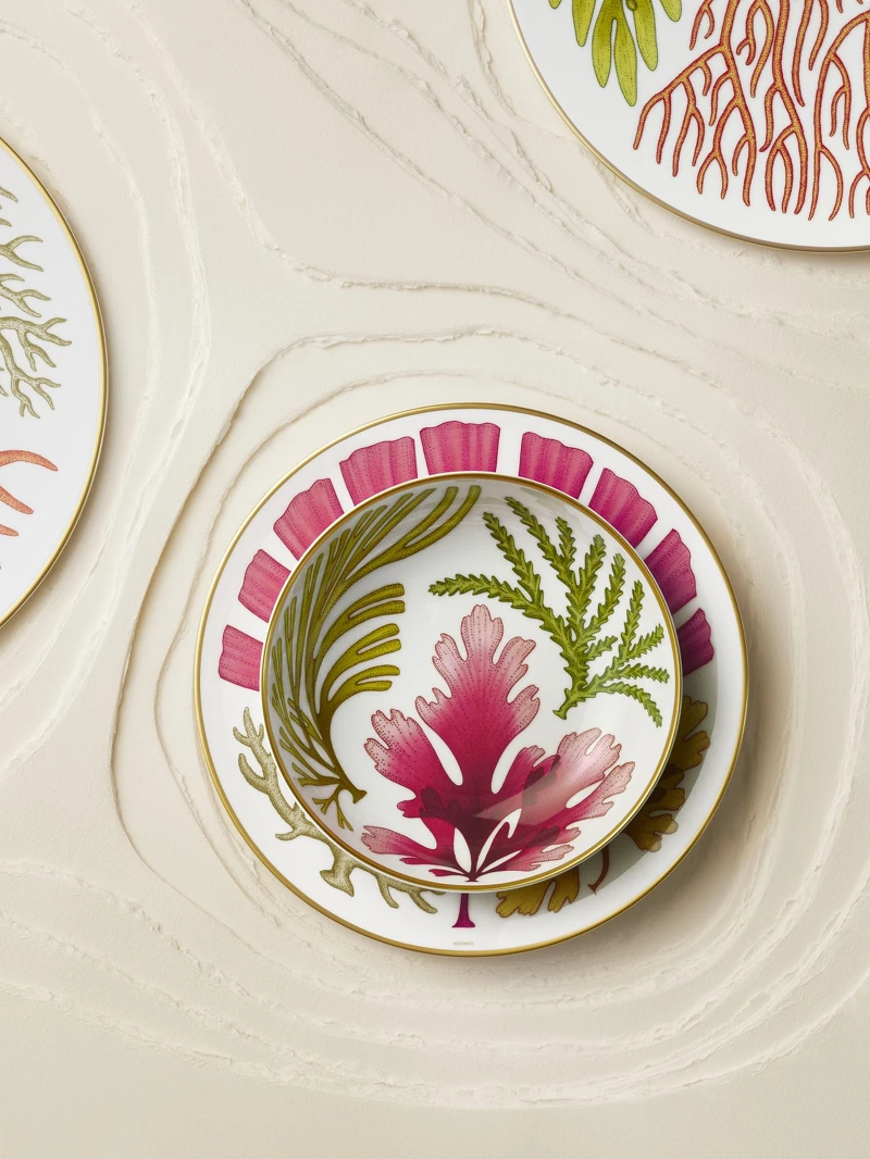 色彩設定上,系列圍繞珊瑚粉、海藻綠與礦石沙三個主題色。但為了將藝術家的手繪稿如實轉化到陶瓷上,團隊實際運用了多達三十種色階,以精準控制顏色的深淺與過渡。藉由這樣的細膩調配,植物纖細而近乎半透明的枝狀形態,得以沿著瓷製茶壺、餐盤與碗器的曲線自然鋪展、交疊,最後再以手工描繪的金色細線點綴,呼應光線在海中折射時的粼粼倒影,構築出一座只存在於愛馬仕語境中的海洋花園。