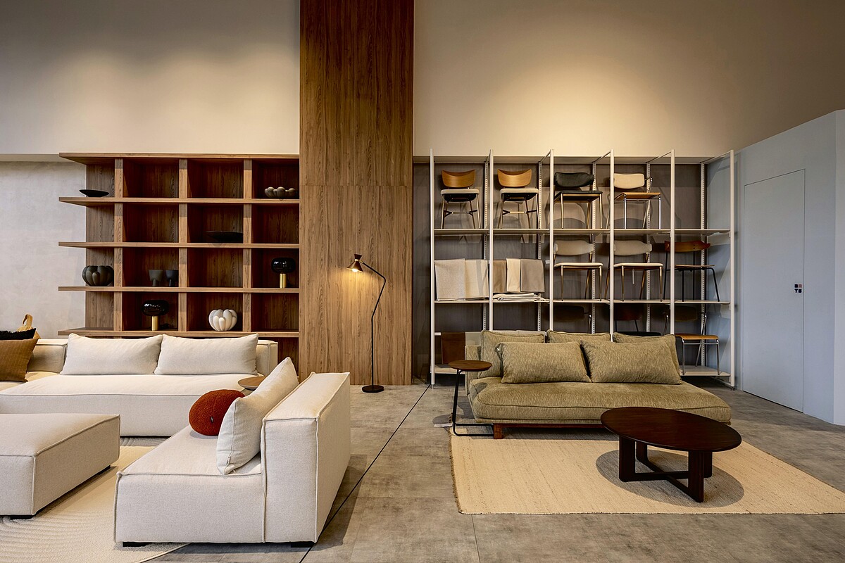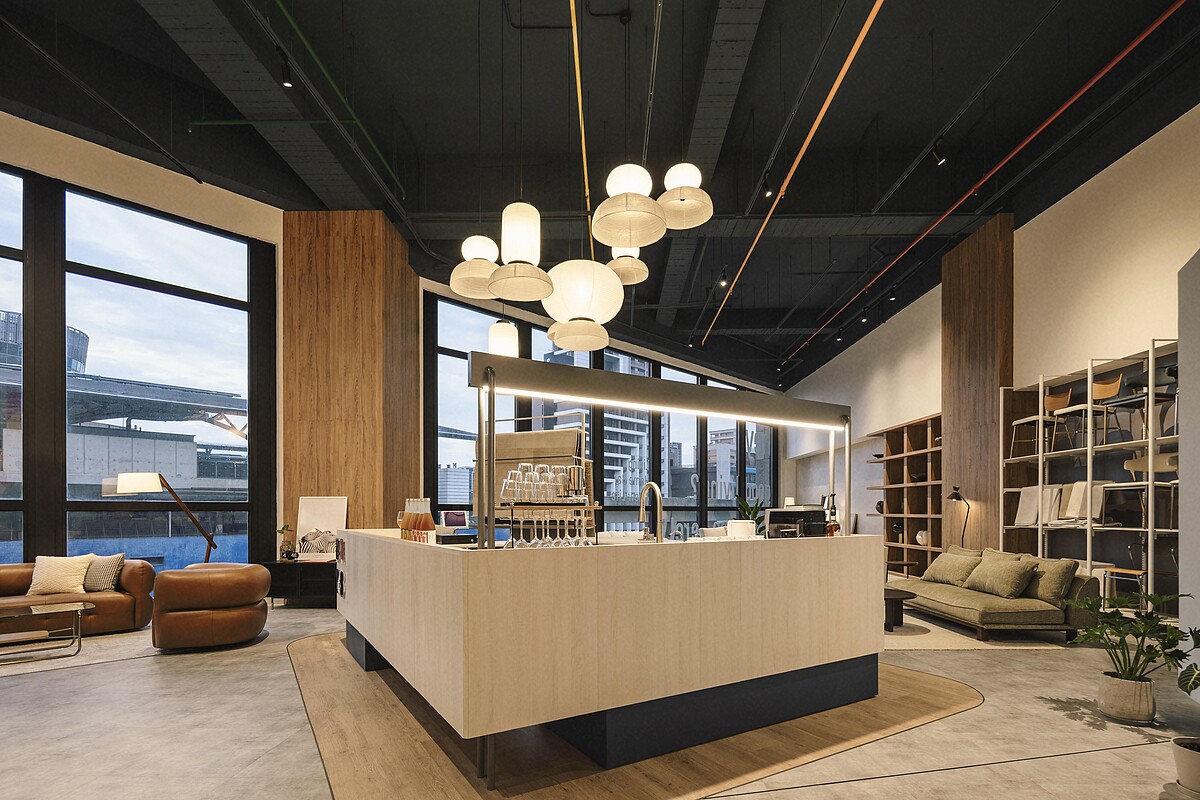 青埔門市將品牌想法更透徹地落實在空間中,以包浩斯精神構築幾何線條的秩序,再用溫潤木質點綴出空間的呼吸感。大片落地窗與鬆開的動線設計,模糊了商場與家的界線,讓人自然地想坐下來停留,甚至僅是靜靜發呆。這裡沒有銷售導向的催促,只有大面積的留白,讓生活的美好在家具之間自行發生。