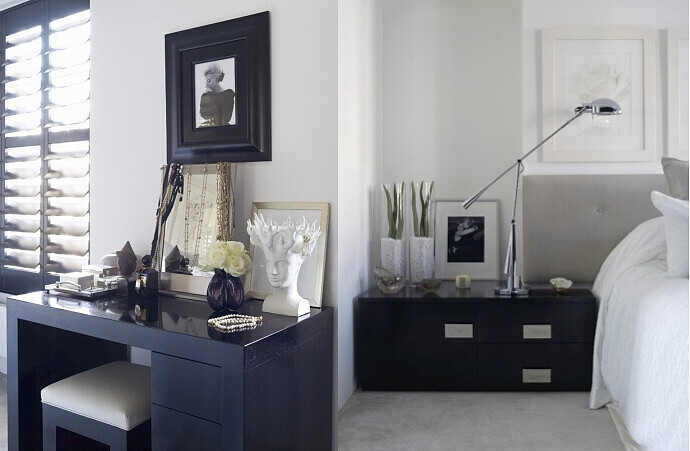 集聚女主人夢想的感官奢華,主臥室床寢來自幼時生活成長接觸的非洲西洛可 sirocco fabric 織品;化妝桌上除了擺放家人照片外,噢!牆上掛的正是 Kelly 偶像-瑪麗蓮夢露相片。以黑木窗與地板打造的沉靜主衛,在泡澡缸旁多設置了一階踏階,每次泡澡猶如走向祭壇般神聖無瑕。特別值得注意 Kelly 在浴缸旁的長型玻璃花器中,注入約三分滿的水量,並放入花苞,營造輕盈的自然感,也很值得學習。