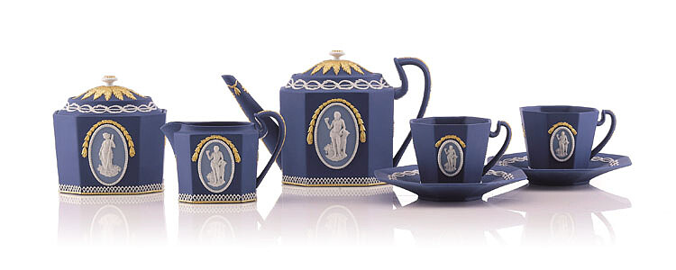 「八角鍍金茶具組」造型獨特,設計靈感源於一件陳列於Wedgwood 博物館的19世紀作品。每一件作品都由接受嚴格訓練的裝飾工藝師將浮雕裝飾,比對正確的位置,崁在浮雕玉石上,並且施以經過計算後的力道,讓浮雕裝飾能永久附著,且不會沾污邊緣與精緻雕飾。薩克森藍的優雅色調,及考究的鍍金工藝,每件產品需要6個Wedgwood資深工藝師花費超過19個小時才能完成。