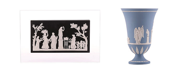 「邱比特與賽姬花瓶」是另一件展現精緻工藝的作品,每一件均出自Wedgwood位於英國巴拉斯頓工廠的工藝大師之手。花瓶底部以完美盛開的莨苕葉作為裝飾,蒼藍色浮雕玉石上的白色淺浮雕,描繪美麗的賽姬公主與維納斯之子—邱比特的愛情故事。