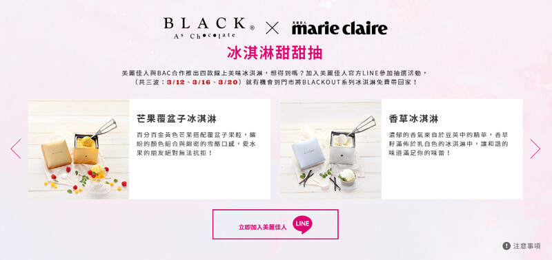 誰說甜點不能很時尚?黑色是經典,是精緻,是時尚,也是巧克力。Marie Claire美麗佳人與知名甜點品牌「Black As chocolate」跨界合作舉辦線上冰淇淋甜甜抽活動,透過LINE輕鬆抽選,就可以輕鬆地將四款包裝設計時尚精美,以各種嚴選材料和新鮮水果製成口感滑順的「BLACKOUT」系列冰淇淋帶回家。讓妳一邊逛展一邊品嘗美味!