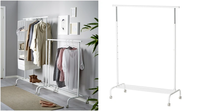 非常方便的RIGGA吊衣桿,可根據不同的需求調整6種高度,底部的層架也有置物空間可以放置鞋子、置物盒。