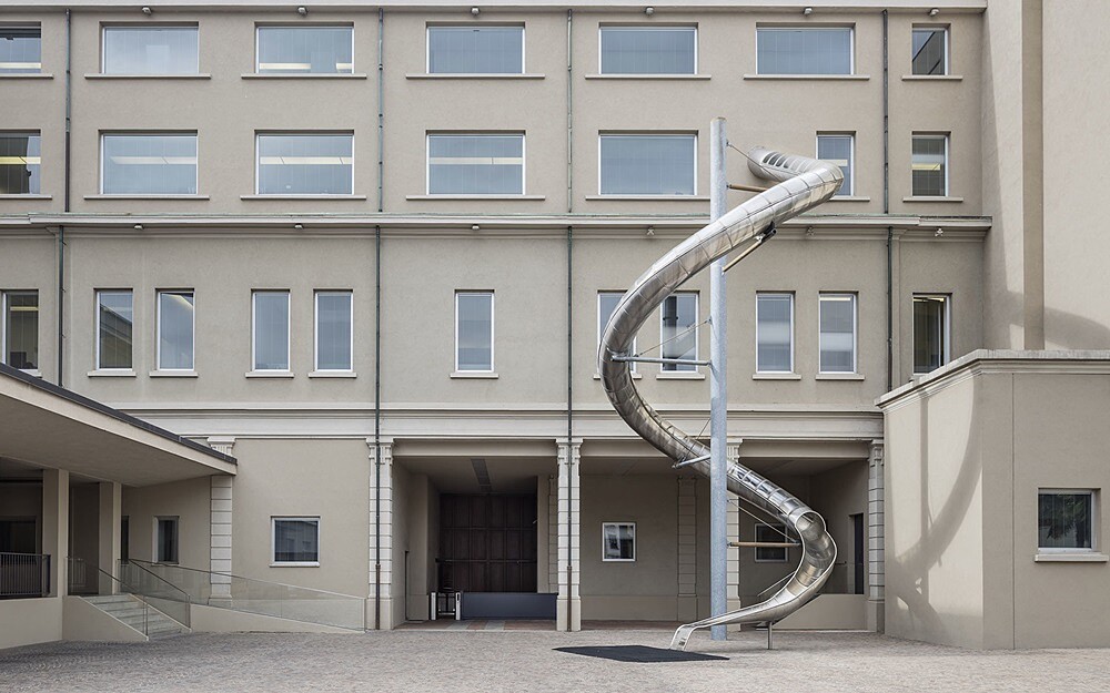不斷致力創作跨界美學,將藝術與時尚緊密交融的她,連辦公室也不放過,找來比利時當代藝術家 Carsten Holler 設計的金屬材質溜滑梯就這樣貫穿總部,從 Miuccia Prada 三樓的私人辦公室直接通到地下停車場。Carsten Holler 的作品向來帶有強烈實驗性與趣味性,2006年在倫敦泰德現代美術館展出溜滑梯裝置藝術後聲名大噪,倫敦「Orbit Tower(軌道塔)」上的世界最長溜滑梯就是出自他之手。「這個溜滑梯的存在不是為了任何人,而是為了我自己上班的樂趣。」Miuccia Prada 這麼說。