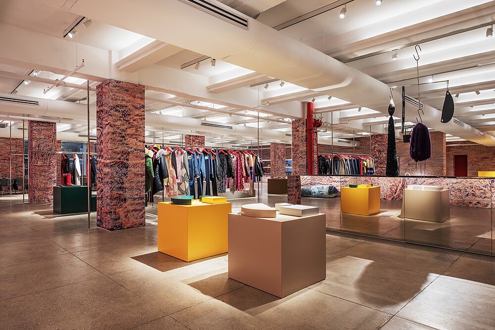 Calvin Klein 迎接 Raf Simons 成為創意總監的同時,這個創立於1968年的極簡品牌也做了很大的改變。由Raf的好友,當代首屈一指的藝術家 Sterling Ruby 位於 205 W 第39街的品牌全球總部一樓展示空間、第12層樓零售店和媒體展示間,以及位於 Madison Avenue 的全球旗艦店。向來予人九○極簡美學印象的 Calvin Klein 這回倒是走向了繁複主義,Sterling Ruby 用布料或毛線編織的巨大軟雕塑、美洲印第安民族風情的圖騰毯子、掛置在天花板的現成物品,座落在繽紛的空間裡,讓 Calvin Klein 的空間多了一份當代潮味。