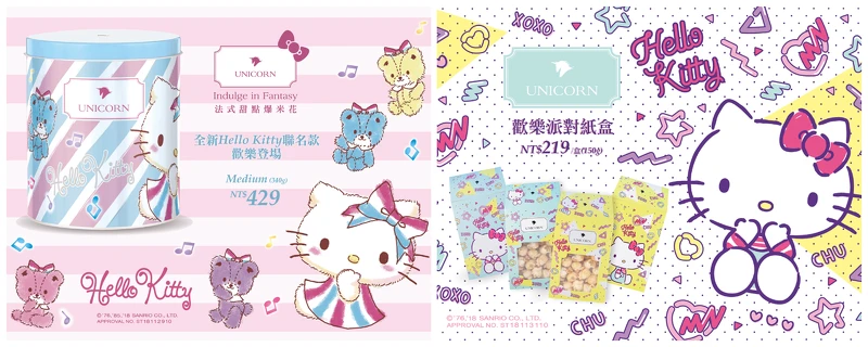 UNICORN每一粒爆米花皆由專人精心篩選製作而成,嚴選2.4公分以上的爆米花,以手工精心裹上各種口味的糖衣,每個爆米花都均勻裹糖,融合堅果、果乾,細心拌炒、製作而成。罐裝的爆米花可依個人喜好選擇,有「美式奶油鹽」及「愛戀草莓」兩種口味!如果想要嘗試更多口味的女孩兒,UNICORN還推出了Hello Kitty派對紙盒爆米花,口味更是高達8種任君選擇,像是有辛辣混和甜味的「墨西哥辣味」、季節限定的日式風味「櫻花蝦」,愛吃甜的則有巧克力、焦糖杏仁,甚至有芒果蔓越莓及草莓水果口味可以選購!