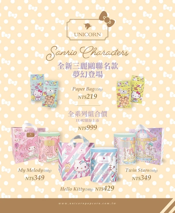 現在只要UNICORN官網或是專櫃購買「三麗鷗聯名」全系列三個款式一起收藏即可享9折優惠。即日起,至2019/1/2至指定櫃位購買聯名系列商品,消費滿500元可參加「粉紅泡泡轉轉樂」,有機會抽中「日本東京三麗鷗彩虹樂園門票」或「HELLO KITTY RED CARPET雙人套餐券」等好禮唷!