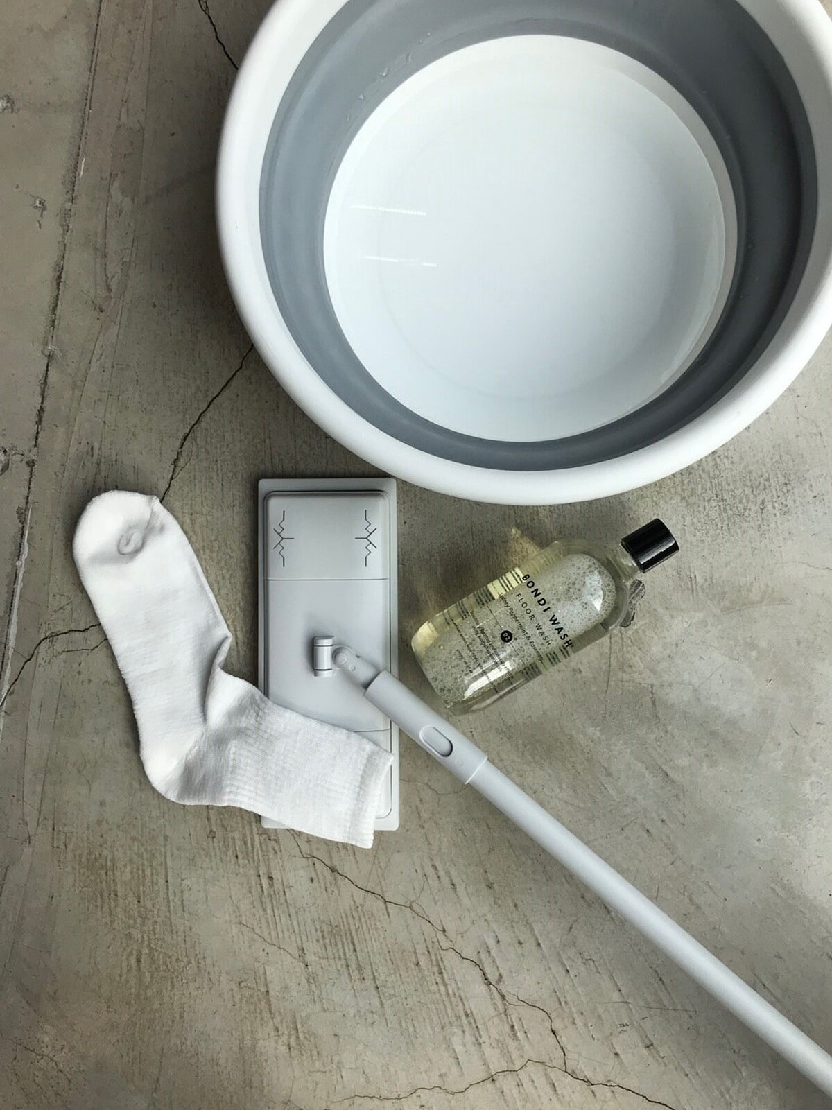 1.將乾淨的襪子或毛巾布浸泡於稀釋的地板清潔液後擰乾。