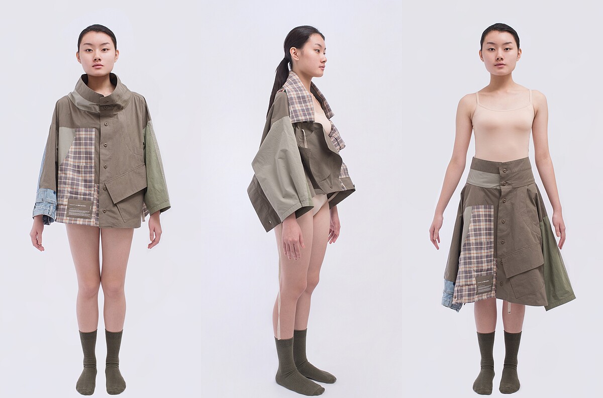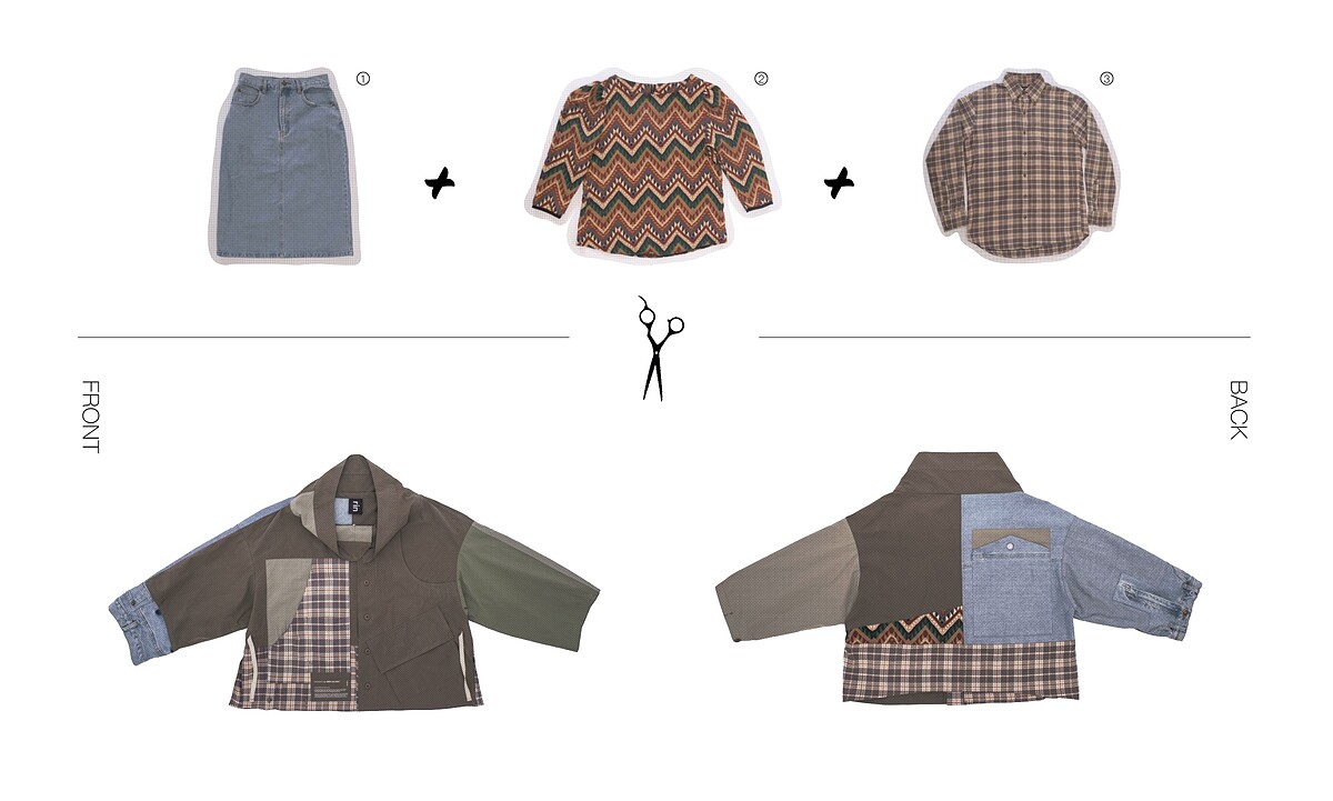 不同於單件舊衣改造的常見手法,設計師創意拆解三件舊衣的時尚特色,並可客製化討論拼接顏色與配布,再由專業師傅手工縫製,簡單三步驟舊衣服搖身一變為「一式三穿」的IT Jacket,可以當作立領襯衫,或顛倒反穿變身開襟夾克,更厲害的是還可作裙裝,依照心情恣意打造多層次的創意搭配;或者,也可選擇兩件舊衣改造成拼接潮Tee,打造個人化時尚穿搭!