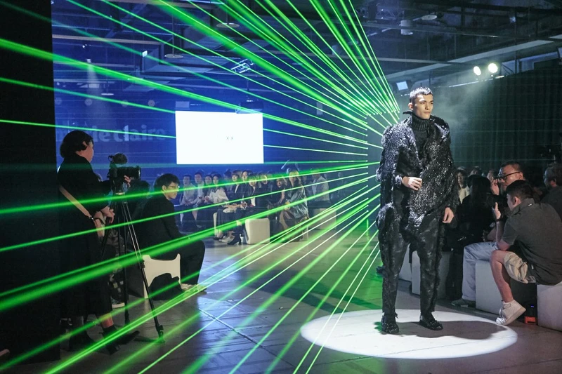 28日PARTY結合五位設計師的作品,加上藝術家莊志維的《裝置微光計畫-The Future Is…》用雷射光束打造出微虛擬舞台,隨著雷射出現才能知道RUNWAY在哪,讓這場秀充滿了創新與驚奇感。